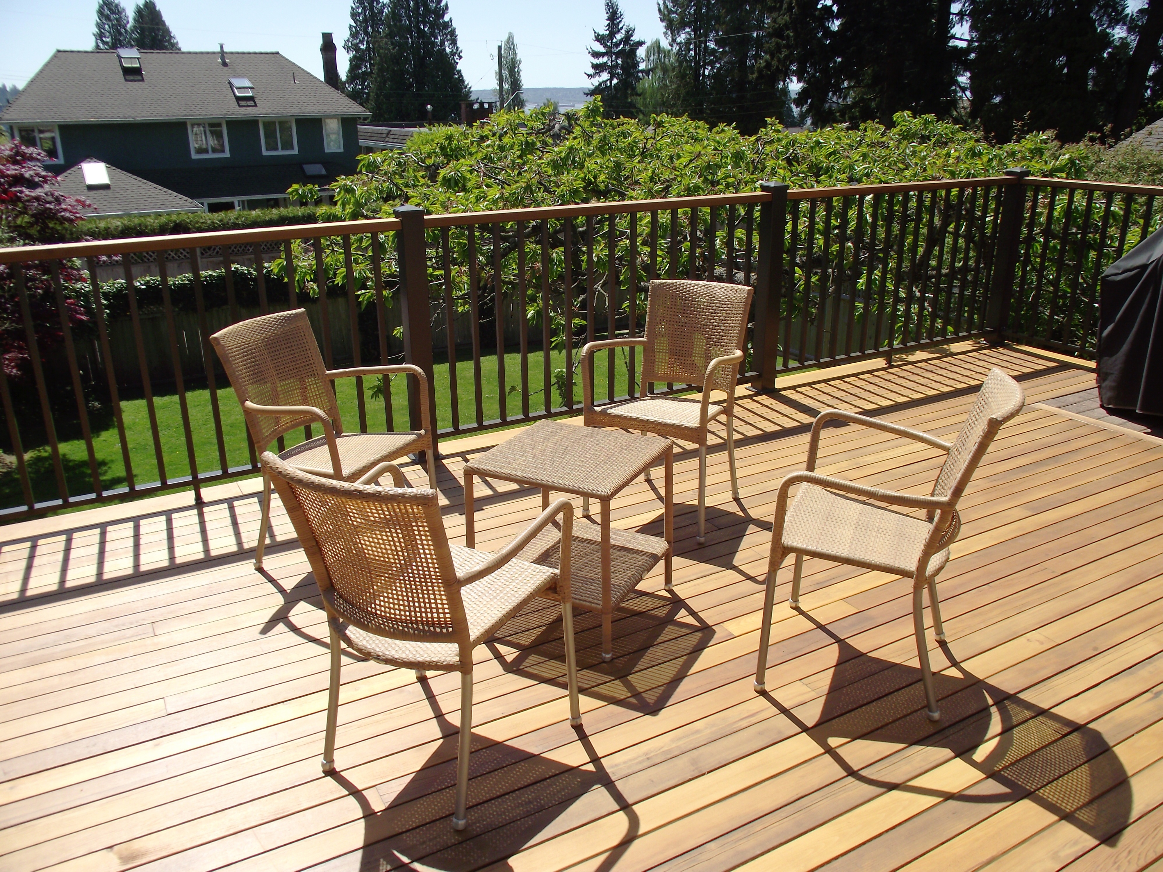 - 3 different pictures on back of card for vinyl deckin, aluminum railings and wood decks