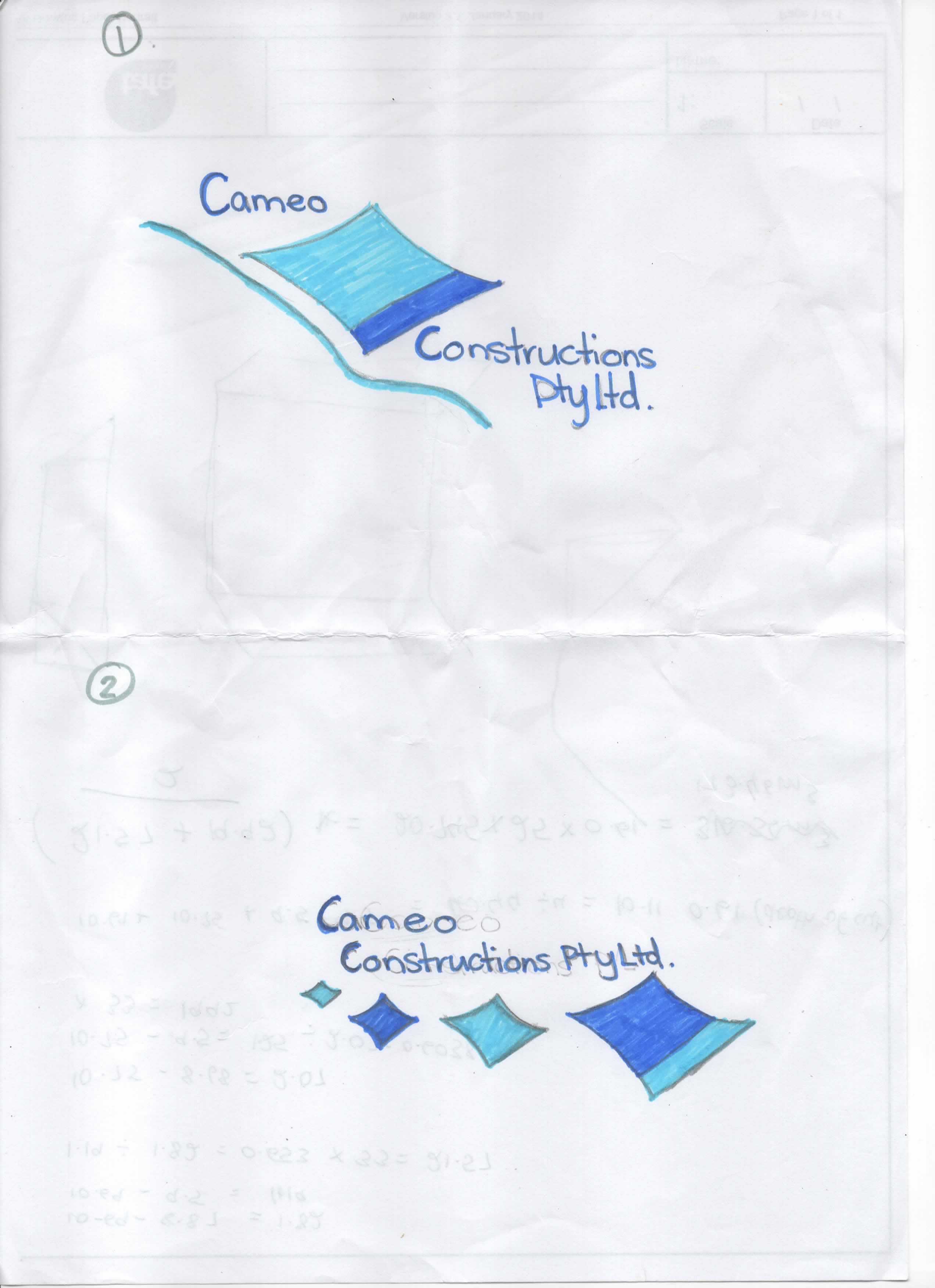 I am a construction Company based in Brisbane Australia called Cameo Constructions Pty Ltd , I need a logo using light and dark blues, i need the logo to be suitable to be used on letterheads, quotes, invoices, shirts, cards etc, i want one logo that can be used on all of these things. i would like to the logo to be clean and modern the attached images is someothing me and the partner have sketched up ( we are leaning towards the bottom image. behing the logo will be grey as in grey shirts grey business cards grey vehilcle etc. i need this logo done asap as i want to hand a few quotes in, Kind regards,