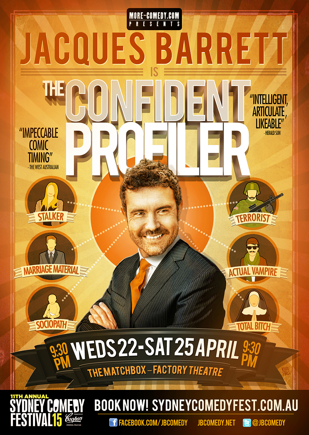 - A caricature of my face with a prominent moustache. (see attached headshot and caricatured style of said headshot on a comedy festival poster earlier this year) and 2 other generic smiling caricatures either side of my face... 1 male, 1 female.