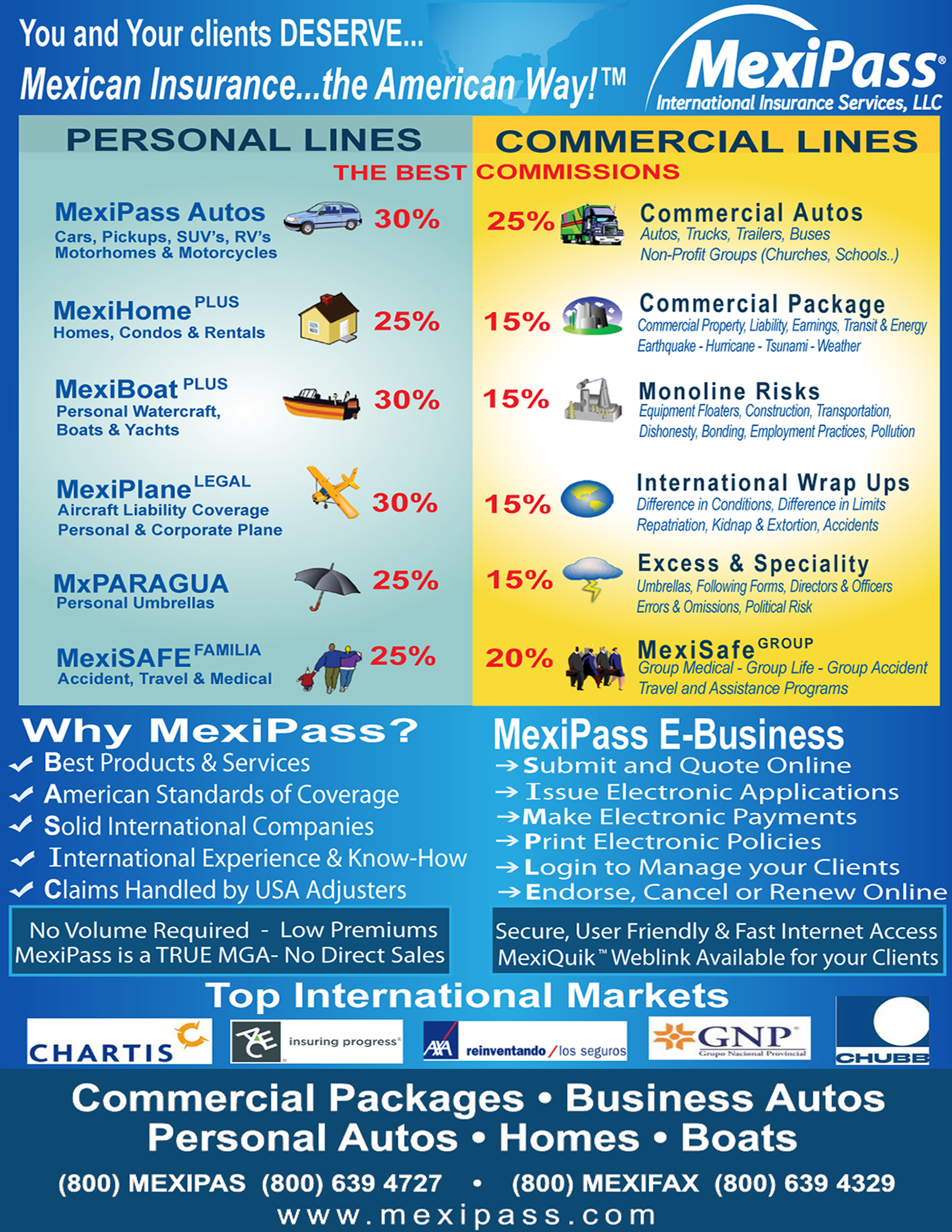 MexiPass sells insurance products and services to cover risks in Mexico (auto, boats, homes, family protection, among others). We offer our products exclusively to appointed Insurance Agents (we do not sell directly to clients), which clients are American Residents (both local and abroad) and Businesses operating in Mexico.