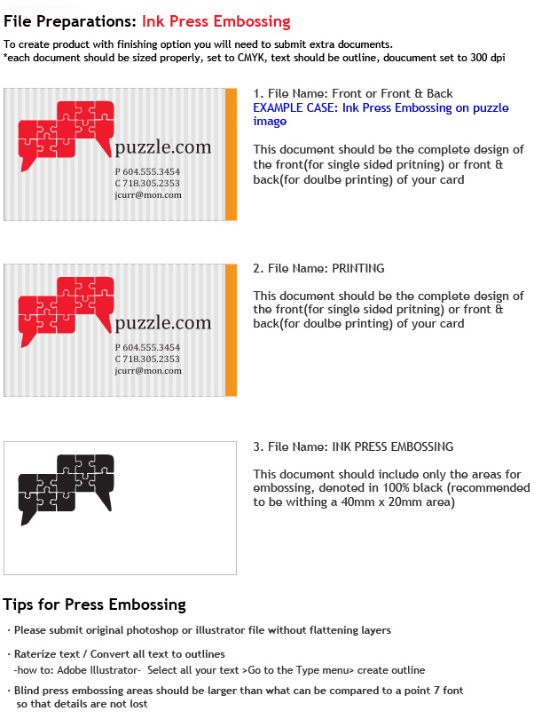 Please refer to attached file labeled "inkpressingembossing requirements" for requirements from my printer. Thank you!