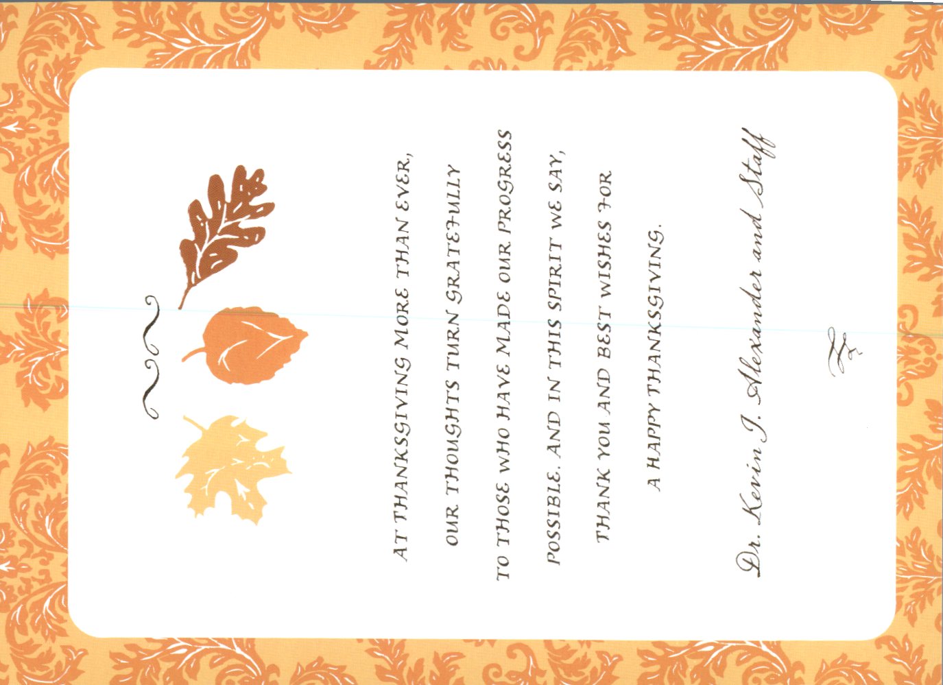 We are wanting to do a Thanksgiving Card for our Dental Office for our patients. Our patients are number one, so this is an important time for our busy practice. The attachment that says "as we pause to express gratitude" is the verbiage we want. The other 2 cards is what we have had in the past and like the design/color/look. We would like this to be a classy/modern look.
