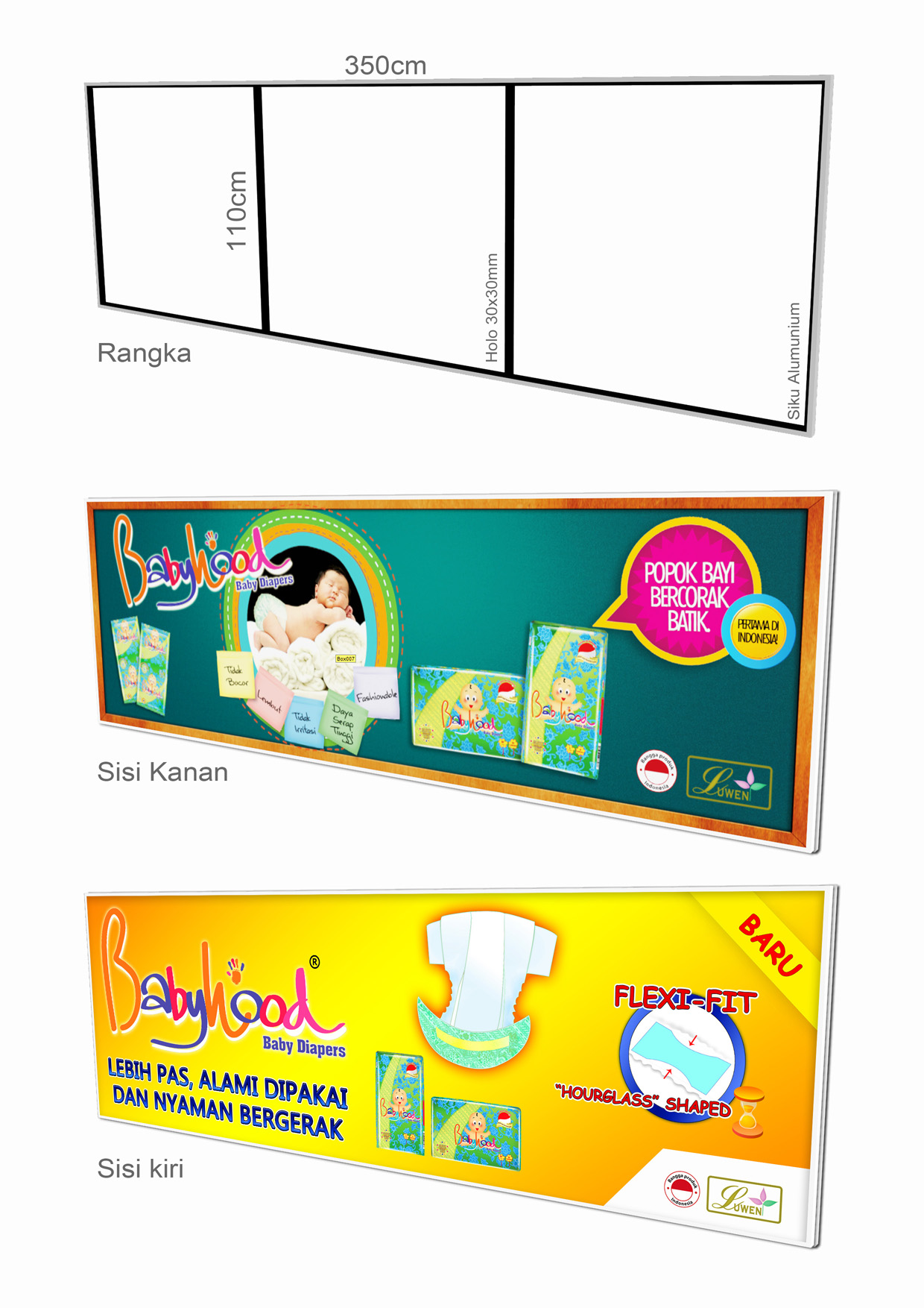 We would like to see the design that use more cheerful color. A diaper is necessary. If possible, put in babies. Our website www.babyhood.co.id and our facebook page babyhoodindonesia are to be inside the design.
