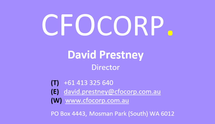 COMPANY: CFOCORPNAME: David PrestneyTITLE: DirectorTELEPHONE: +61 413 325 640EMAIL: david.prestney@cfocorp.com.auWEB: www.cfocorp.com.auPOSTAL ADDRESS: PO Box 4443 Mosman Park (South) WA 6012