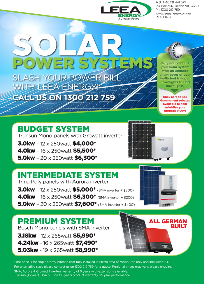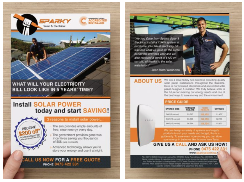 This flyer is to promote the solar arm of our business, however we also deliver electrical and air-conditioning services. If possible it would be great to have a small reference to our air-conditioning service on the front page.We also need to reference the we have finance available.