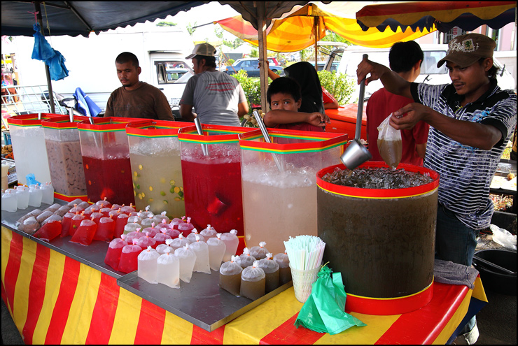 Selling local drinks like bandung, soya bean, grass jelly, pineapple, milo, sweet corn etc.