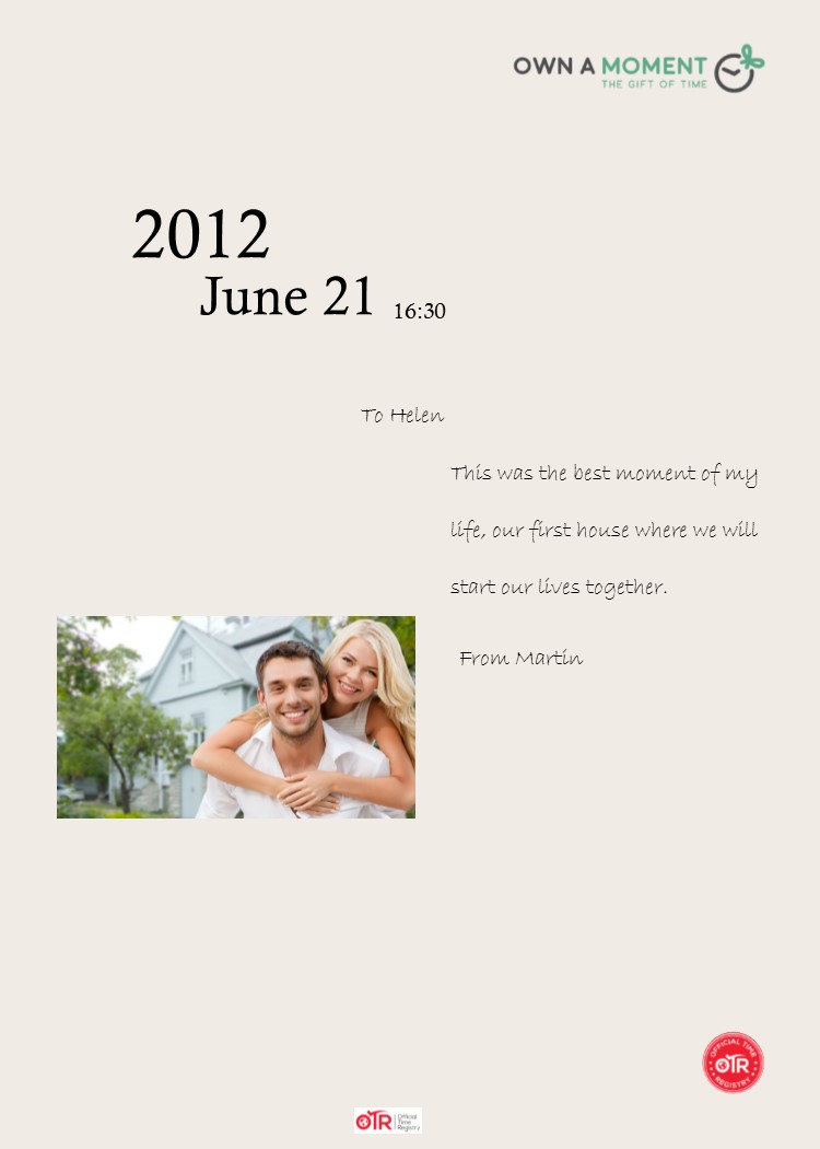 The certificate is to include the company logo as attached Own a moment, and the stamp in the bottom right of the Official time registry, a couple of versions are available, attached is also some text and a couple of photos to use as an idea, or create your own, a very rough example is included, I am not a designer! Lol