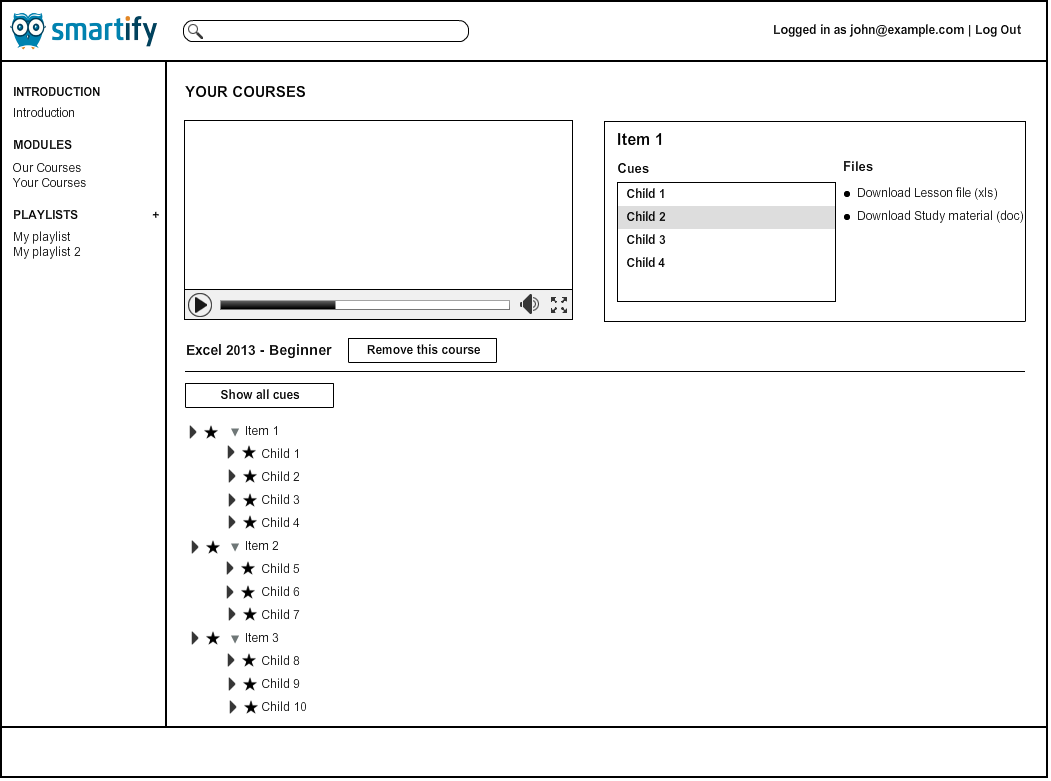 - Should include two pages, one of the video-player page and one of the course list.