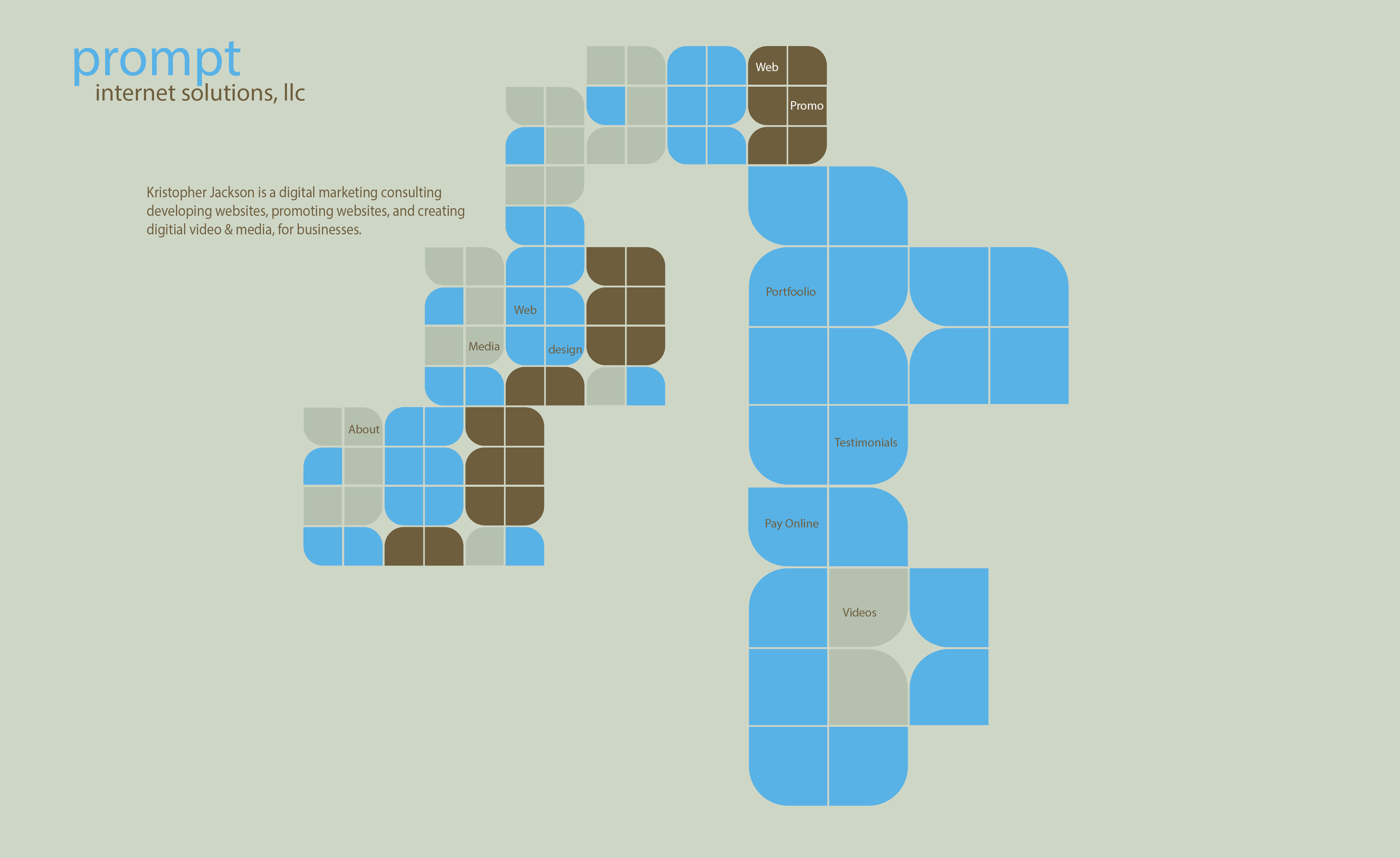 Please see the attached folder. I have random images,etc but most importantly I have an attached image I was working on as a concept of a website. The brown background with blue and brown squares. logo in upper left and a little about me and then the squares would have names on them to lead to a section of the website with more info. I envision, when you mouse over a square, an image would appear so I attached random images here as well. Maybe some squares already have some images too.