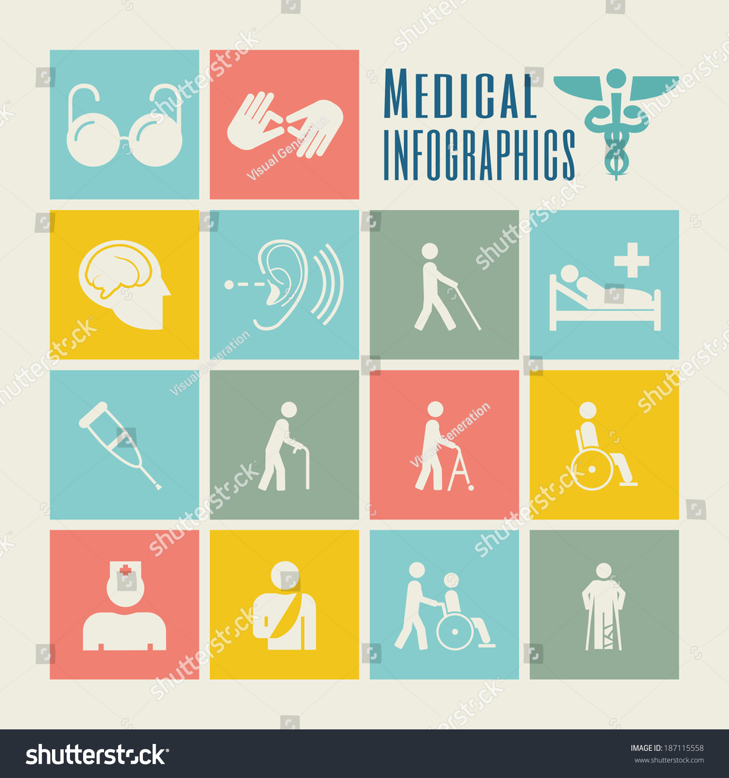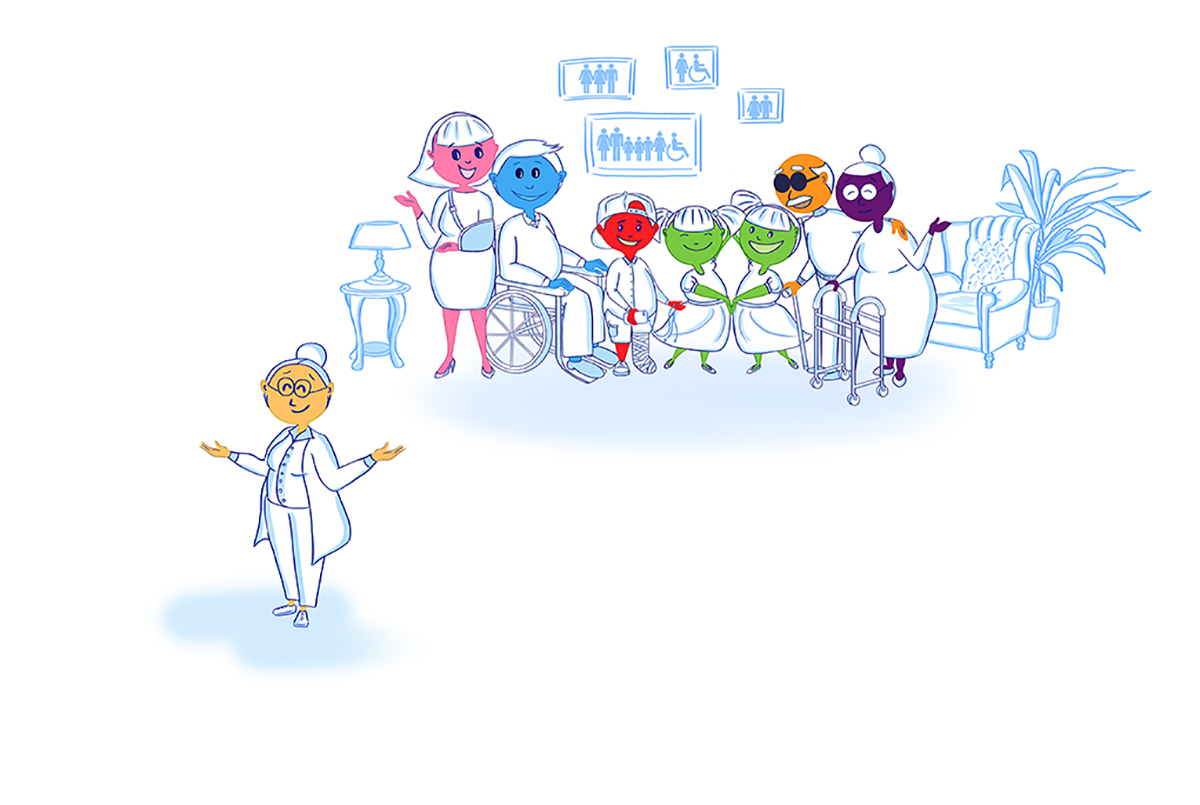 - -Our character the "teacher" as part of the icon illustrating the different type of disability impairment icons.