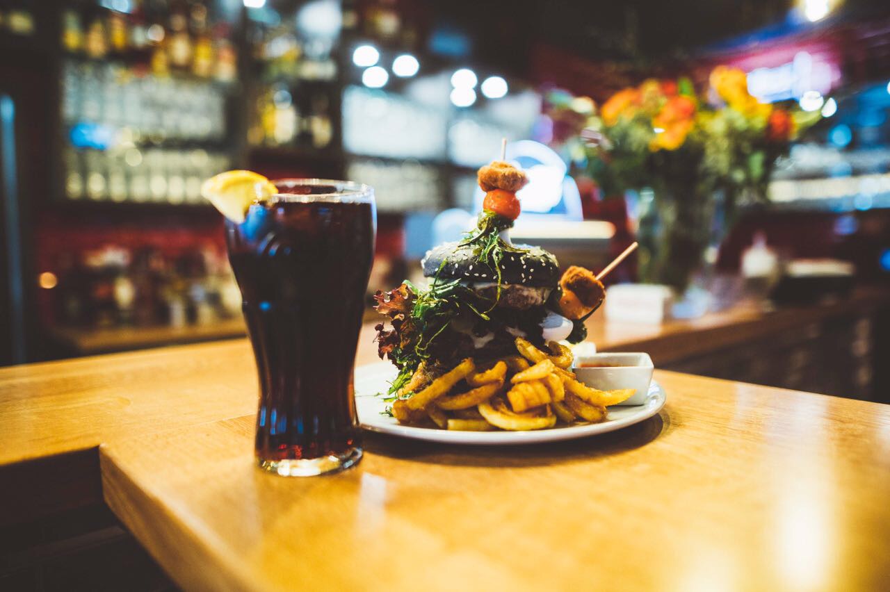 - cool, modern, American. should have the colors of the restaurant's environment (black, red, green, grey)