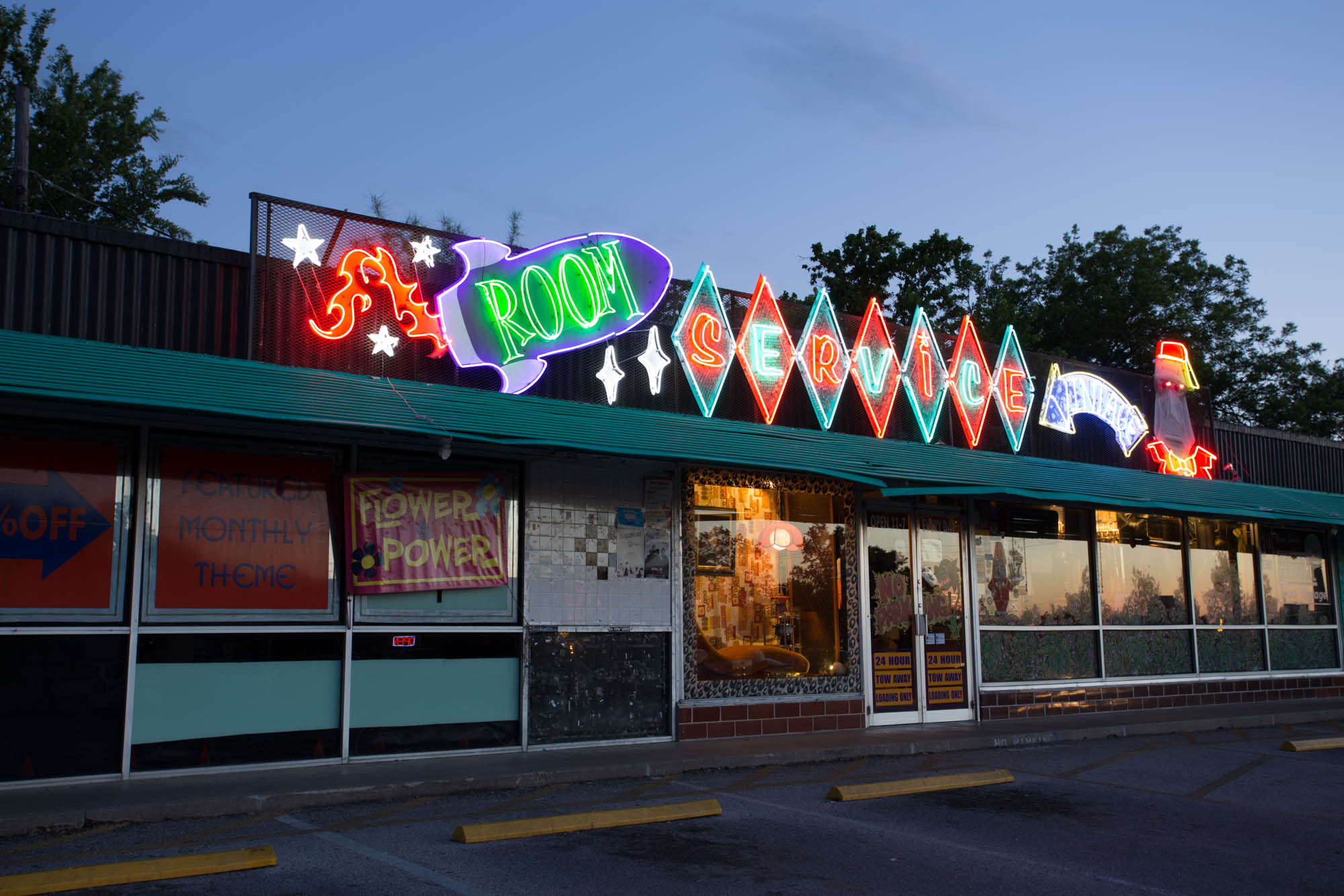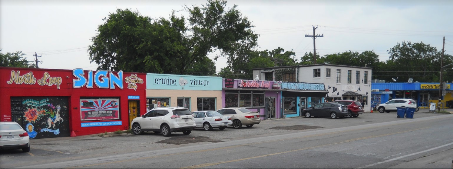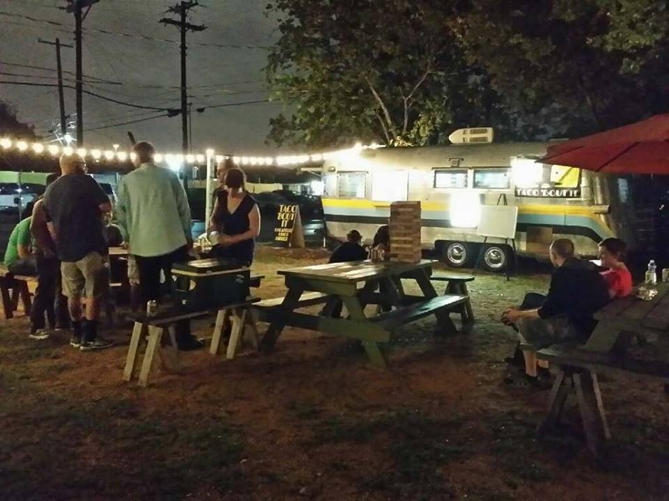 Food Trailer Park in back of an old house that contains small shops.