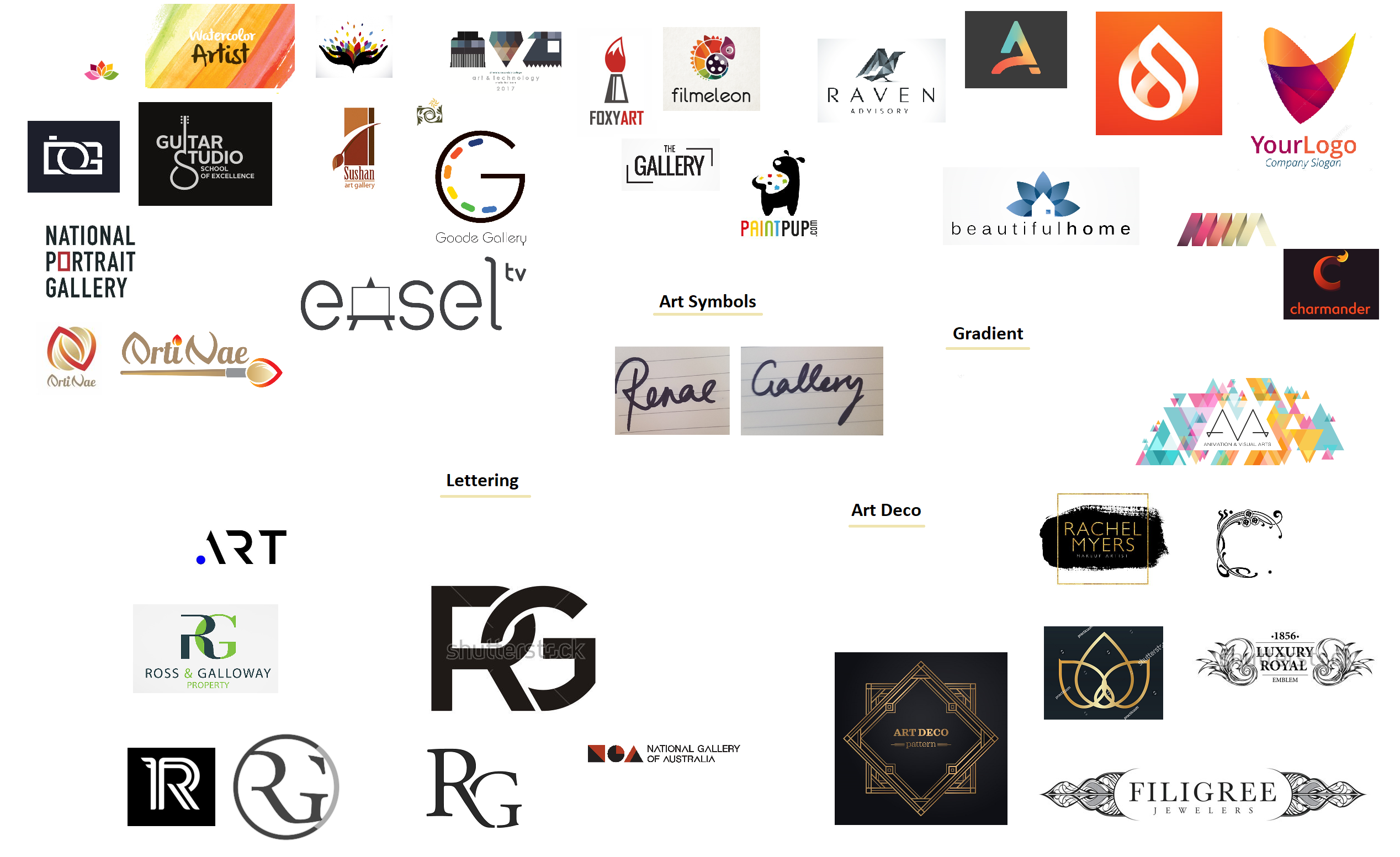 - Art Symbols: I really like clever uses where the logo is linked to the product. Some ideas for this could be to replace the A’s into easels, the G into a palette, or the L’s into paintbrushes. Having relevant pictures is a huge attraction for me.