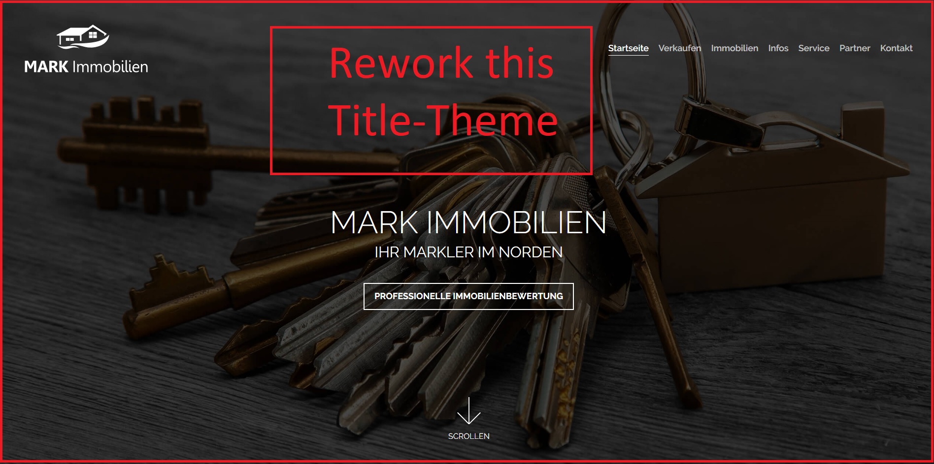 Hello, this is my homepage (http://www.mark-immobilien.de) and I am just looking for a title page for the title screen. So I guess the main target is finding a fitting picture for it. Re-arranging the menu is not a must, but I at the open everything even for new Ideas of additional elements. The rest of the homepage stays as it is. What I'm looking for is taff to describe, I already needed a long time finding the current picture. I am a real estate agent so it should have a link to estates. It could be a dark theme as it now or maybe something more light with "white" in it as you can scroll down. Of course it should work with the elements appearing bottom. Because I do not work in New York, just in a smaller area in Germany, no scyscrappers to find. I hope someone can show up with a new and fitting new title screen for me. I uploaded the logo-file for you to build in. The used font is raleway, cause its used in the logo as well. Its downloadable here: (https://www.fontsquirrel.com/fonts/raleway)