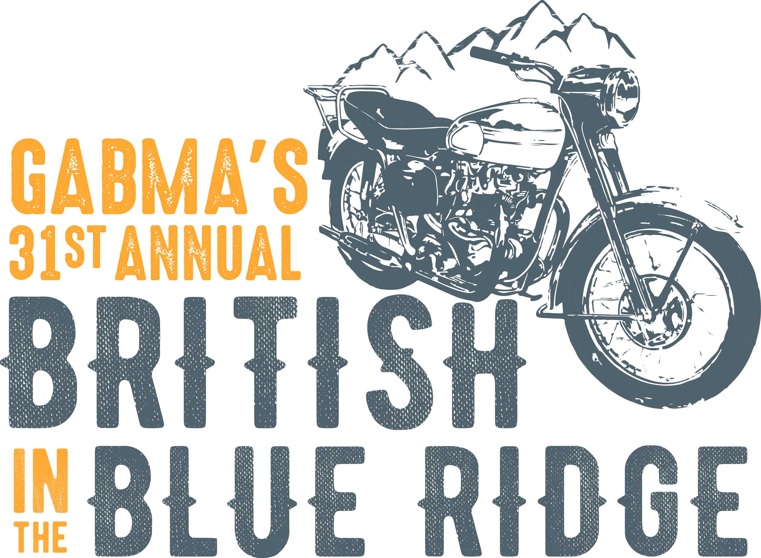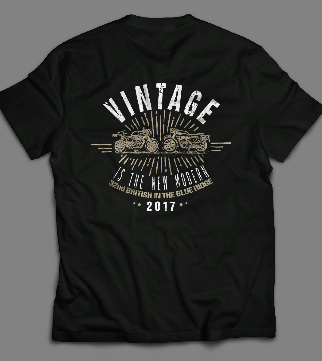 - No more than 2-3 colors, the emblem on the front of the t-shirt design, a numerical number representing the 33rd event, the year of the rally (2018), the name of the event - British in the Blue Ridge somewhere in the design, the club name on the front with the badge - Greater Atlanta British Motorcycle Association