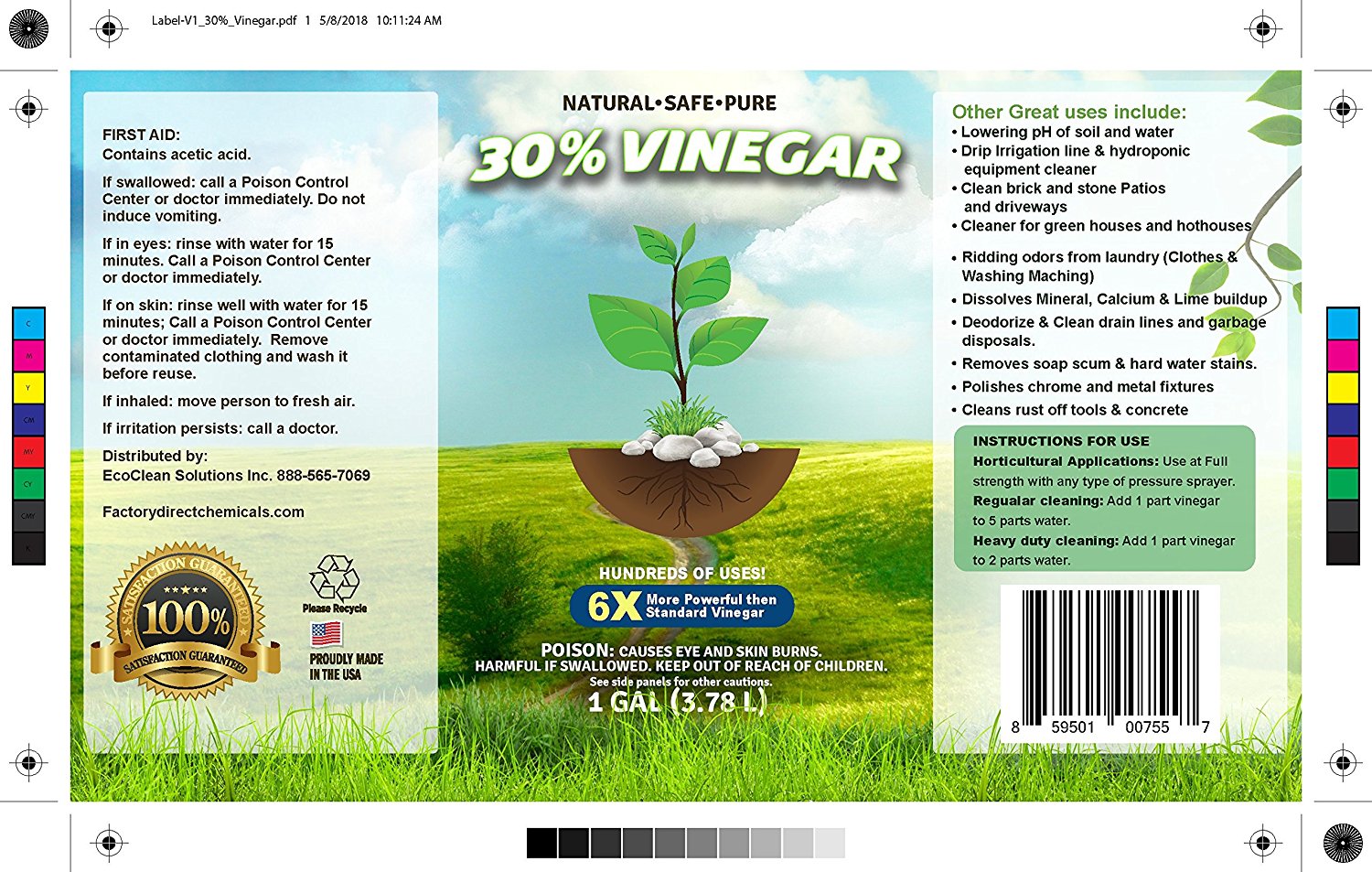 I need a label design for a new company based in Florida called Smokey Springs. We sell natural cleaning supplies. Our initial product is 30% Vinegar - White Distilled Vinegar is the most common type of vinegar in American households and is made from grain-based ethanol which is converted to acetic acid and diluted to preferred acidity with water. White Distilled Vinegar can be used inside and outside of the home for: cooking, canning, pickling, cleaning, laundry, automotive and gardening needs, to name a few. Our vinegar is naturally derived from corn and has no additives. We would like to see designs that use the color green and portray modern/natural/organic. Very clean, simple designs.