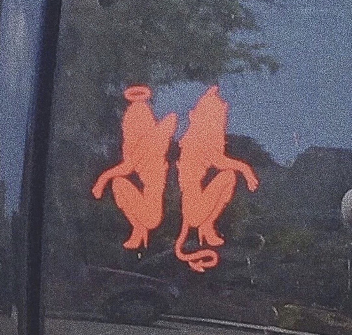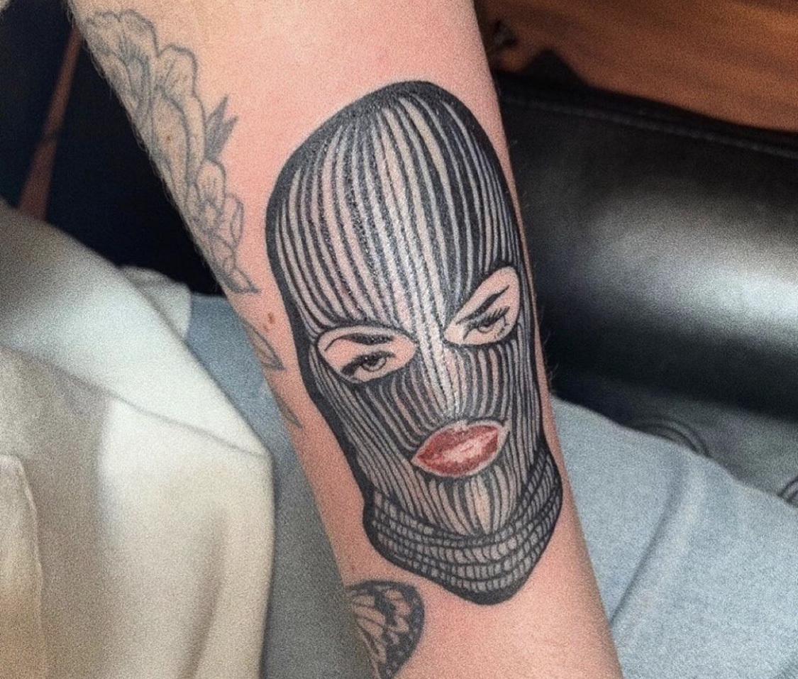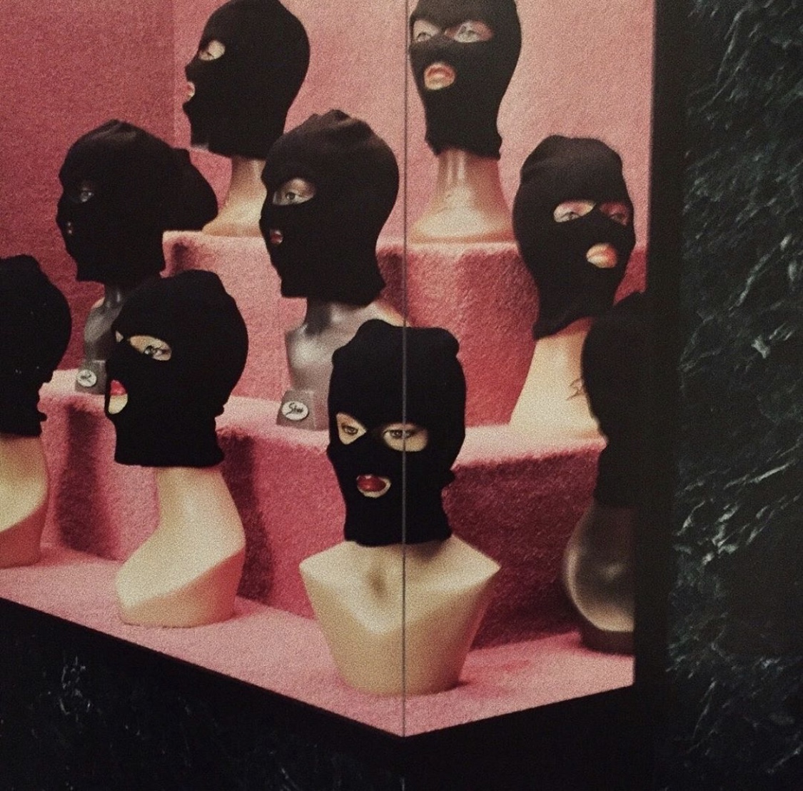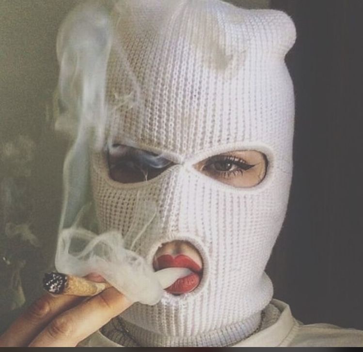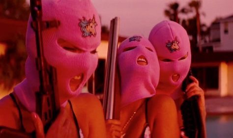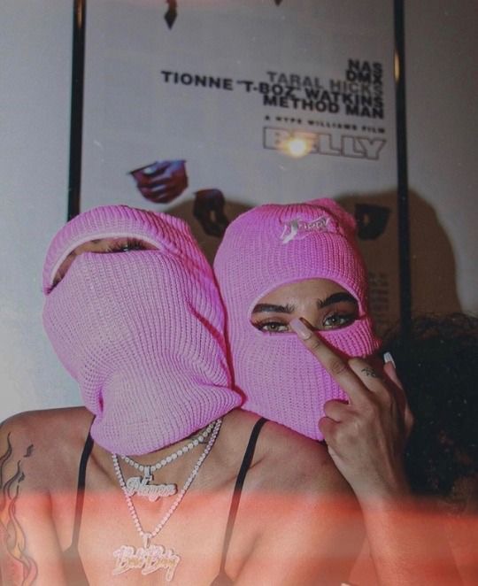A thought: Three ski mask faces. 1st (on left) pink shoulder length hair with mask, 2nd ( middle) long brown wavy hair , 3rd (right) 2 curled buns on top of head. ?