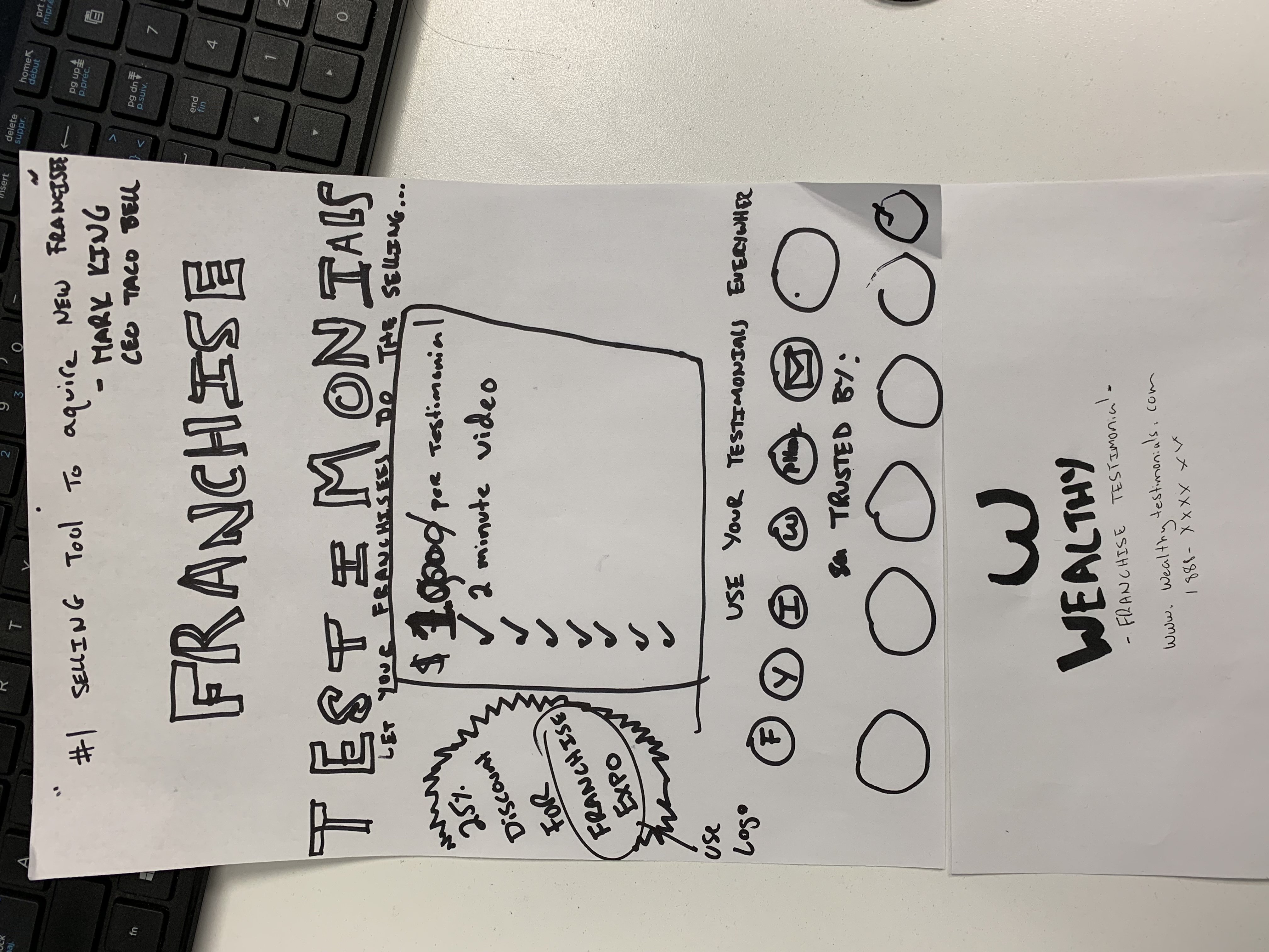 We need a brochure design (8.5 x 11) Info in the design (refer to rough draft I drew on Paper): "#1 selling tool to aquire new franchisees has been video testimonials" - David A. Pace, C.E.O Jamba Juice Franchise Testimonials - Let your franchisees do the selling for you. Franchisee testimonial: $10,000 / per Franchisee Includes: • 2 minute Video • 1 minute add for your franchise's location • Concept creation • Communication with franchisee • Travel to their location • All rental equipment • 1 round of corrections • Animated logo • Licensed music ******* For 25% Discount section (next to middle box), please put the "Franchise Expo Logo" Great to use on all your social media (USE logos and icons) • Website • YouTube • LinkedIn • Facebook • Instagram • Twitter • Phone calls • Emails • In person meetings Some of our clients: (use the logos I uploaded - in round boxes as in draft) LOGO (Wealthy Franchise Testimonial) www.wealthytestimonials.com (866) 931-4303