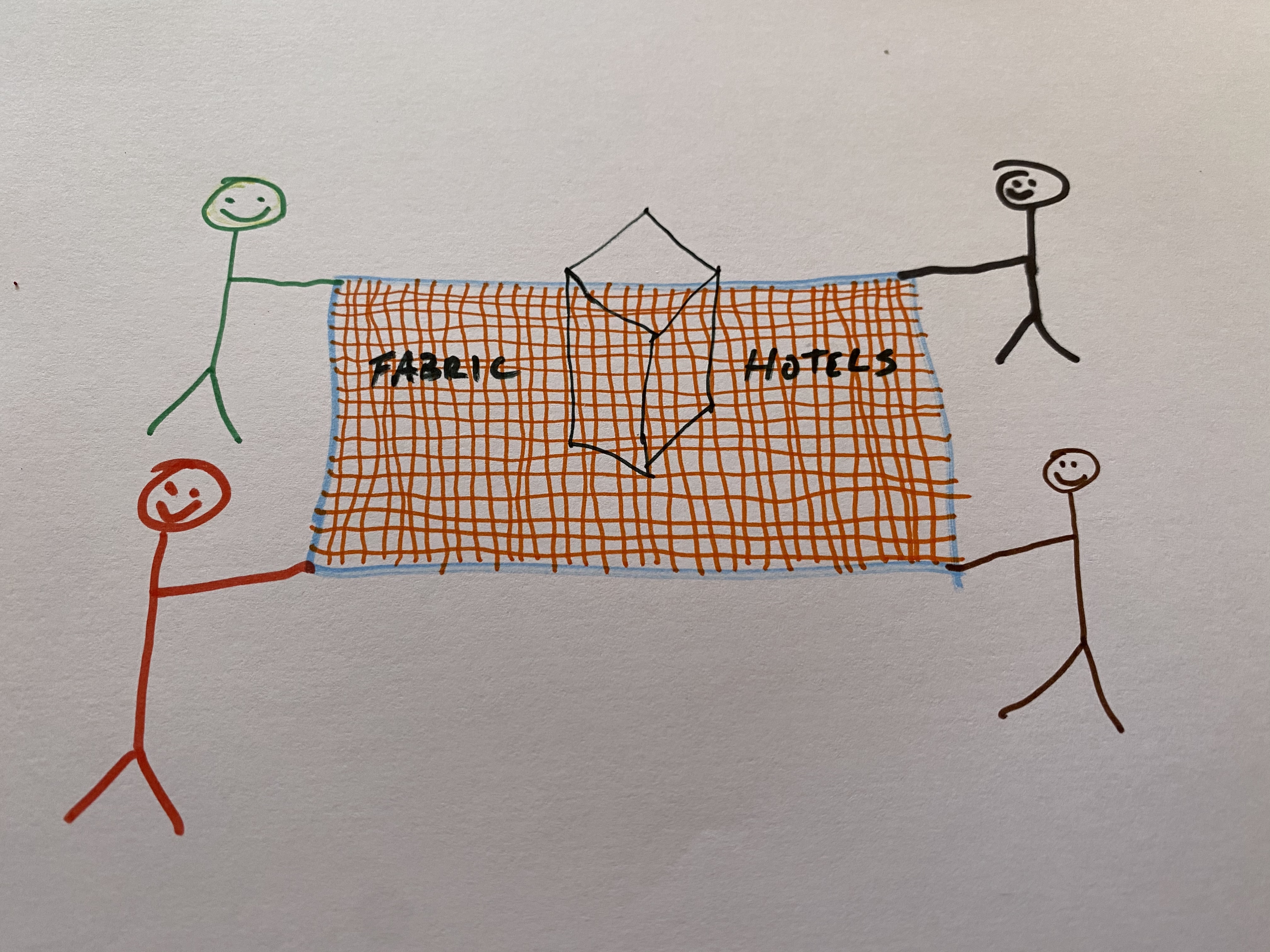 I need a logo for my hotel company called Fabric Hotels. The name Fabric Hotels was chosen because the word, and material, "fabric" is as old as people have been around. Fabric is something that is made from another thing...taking strands of some raw material or fibers, that are woven together to create a new material: Fabric. This new material, fabric, is then used for things such as protection from the rain, wind, sun, or other threats or elements. It can be bright colors and pleasing to look at. It can be used to support things or people, such as a hammock. Fabric is used to make clothing, for both practical and fashionable reasons. The main point of Fabric Hotels will be that they are the same as a fabric is made...the local community in which the hotel resides will own the hotel, having had the local people (the "fibers") "woven together" like a fabric to create a new thing that is strong, resilient, durable, colorful, fashionable and serves a higher purpose by joining together. I am looking for a logo that captures and depicts this "weaving together of the local community" to own and operate the hotels.