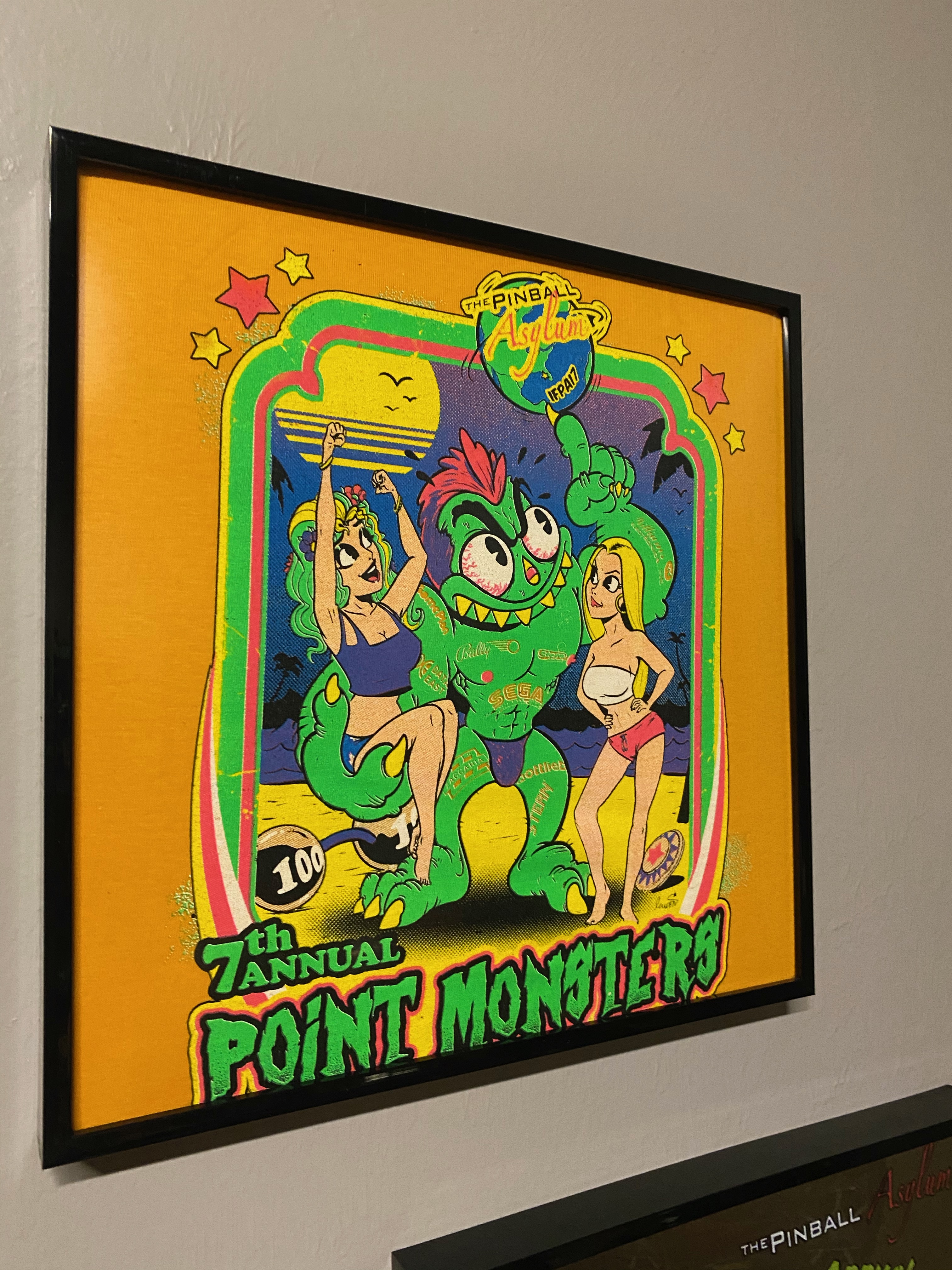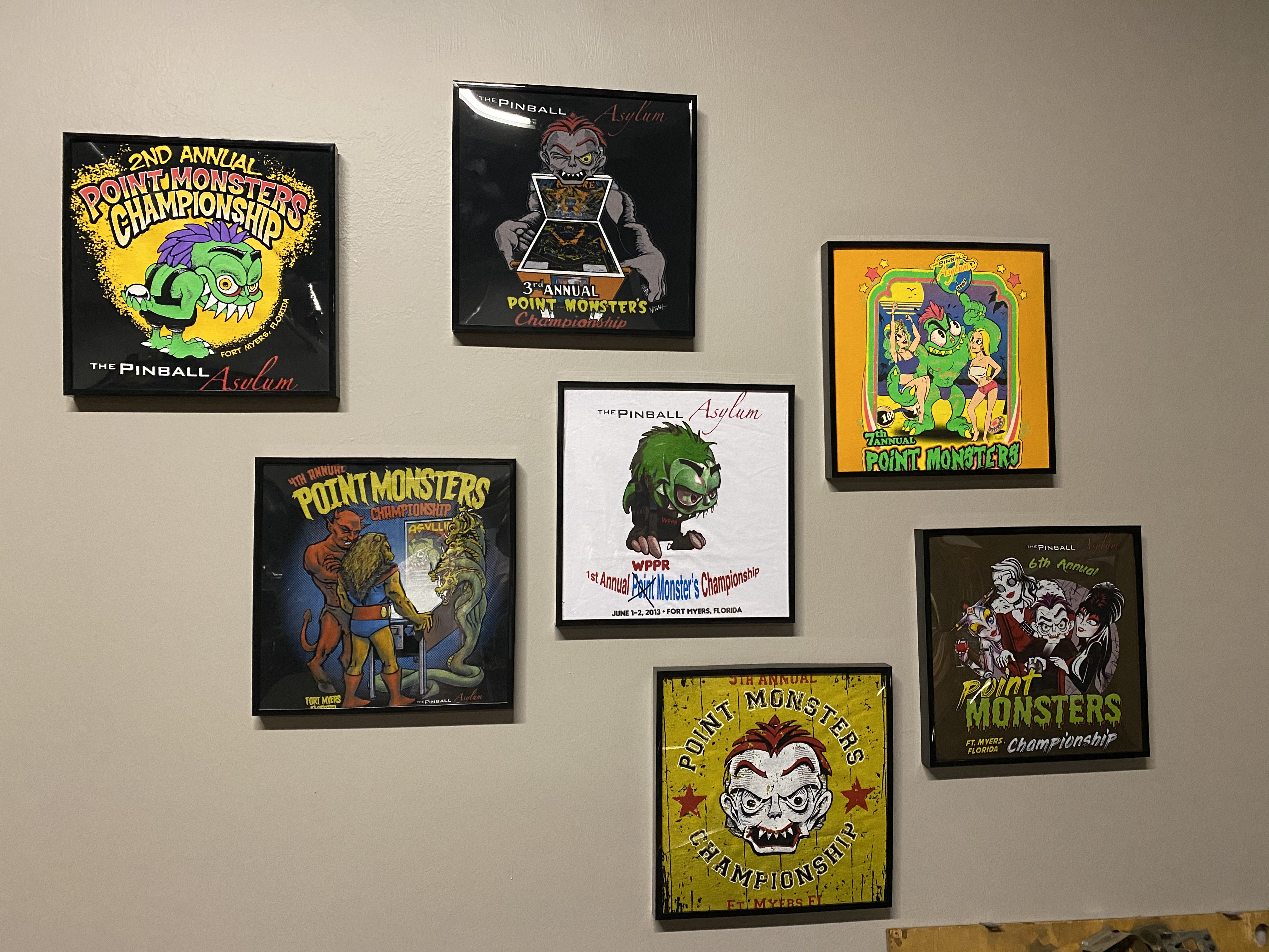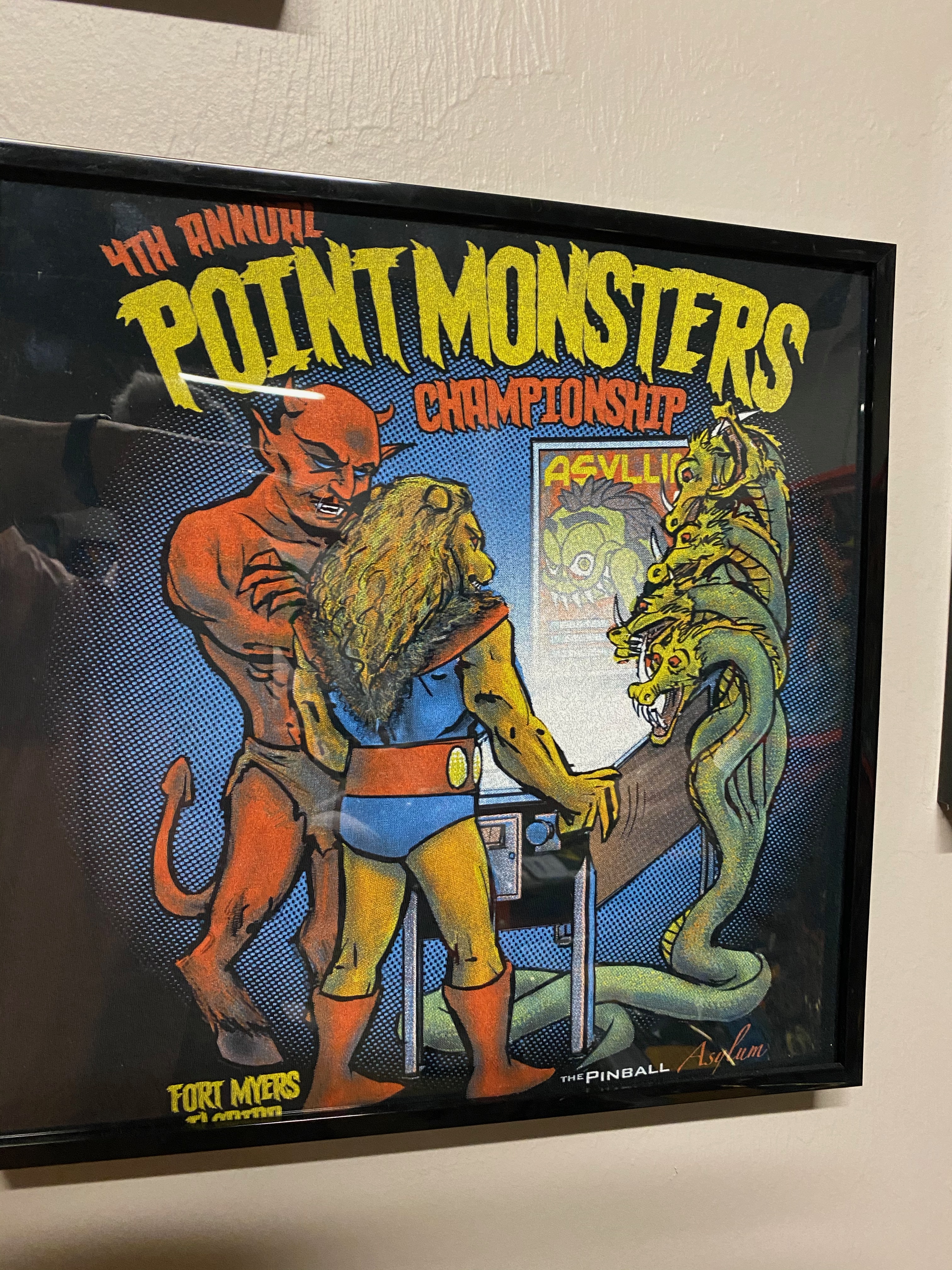 - The Pinball Asylum logo very visible on the top of the design. The words: "Fort Myers, Florida" on the bottom. The words "The 8th Annual Point Monsters Championship" incorporated into design.