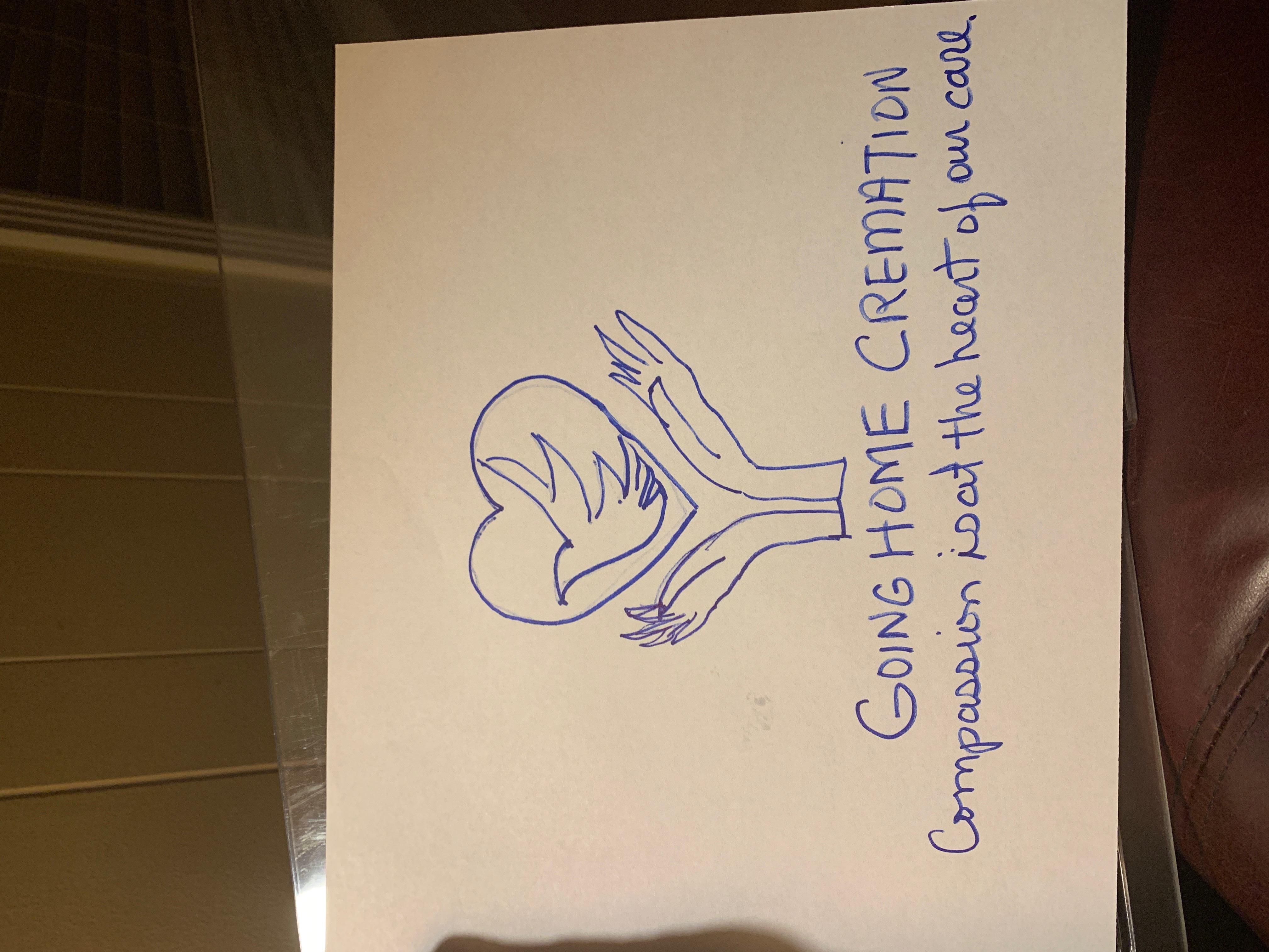 We would like the dove and hands to possibly be in some sort of simple heart shape or circle, sun shape crest. Them having our name and tag line also in the logo. We would like the main color to be blue from out website and then black and white. We would like it to all be capitalized and the text to mimic out website but slightly more professional. Our tag line we would like below and for it to look handwritten professionally but clear. We could maybe try and incorporate the tag line into the crest as one option. We are selling death, so it needs to be professional but with symbolism. But we have to have the hands releasing the dove and for it to look professional and more lifelike than not. Go to goinghomecremations.com to see our color theme and to see the blue we use in most everything. You can also see in the title page of our website the hands and dove. We would like the hands and dove to be very similar to the one in our title page. I attached a photo of one funeral home and how we liked the look of their logo, Duvall Funeral home. We also added a hand drawn example of what we might like. It’s in the photos.