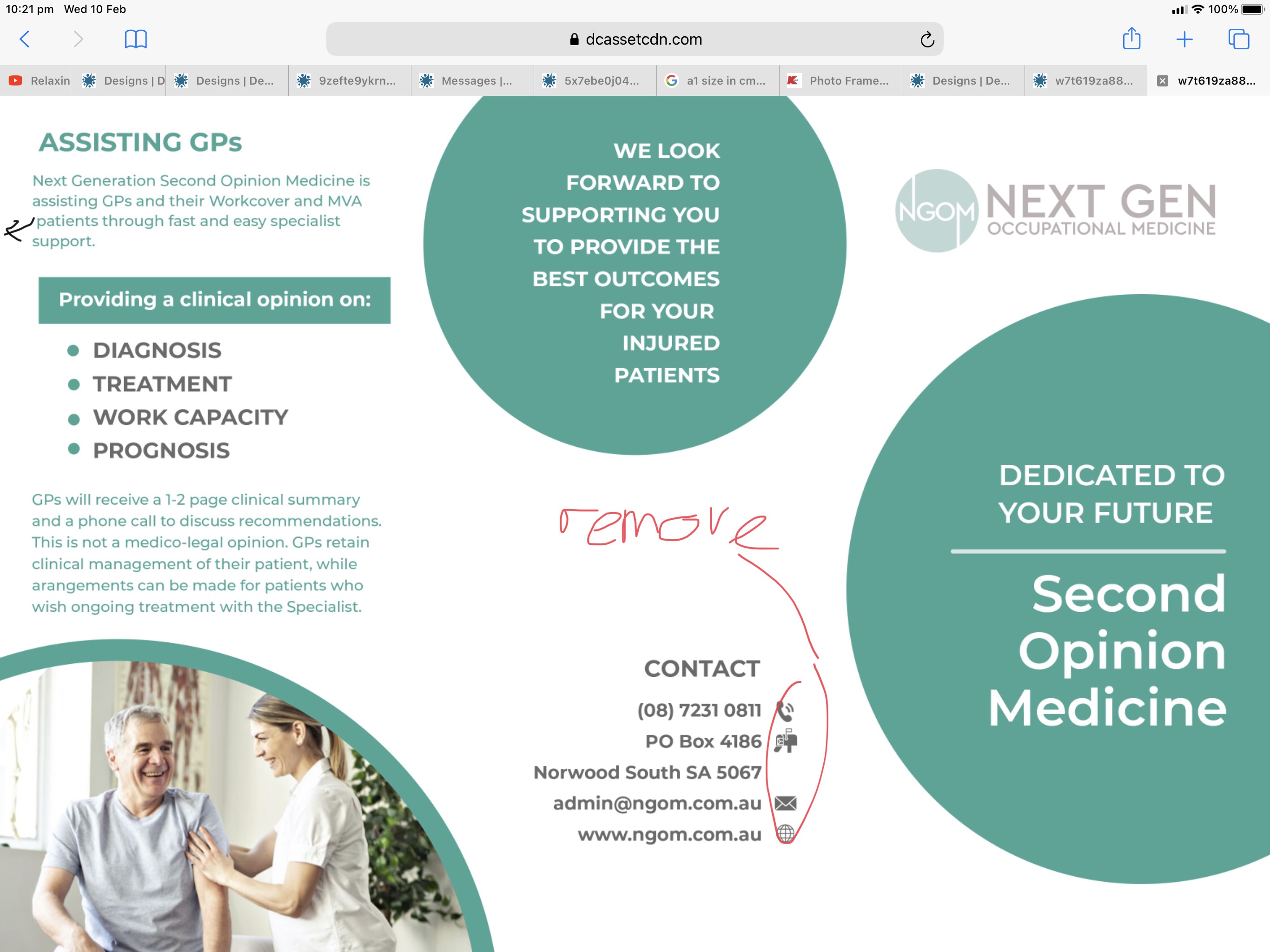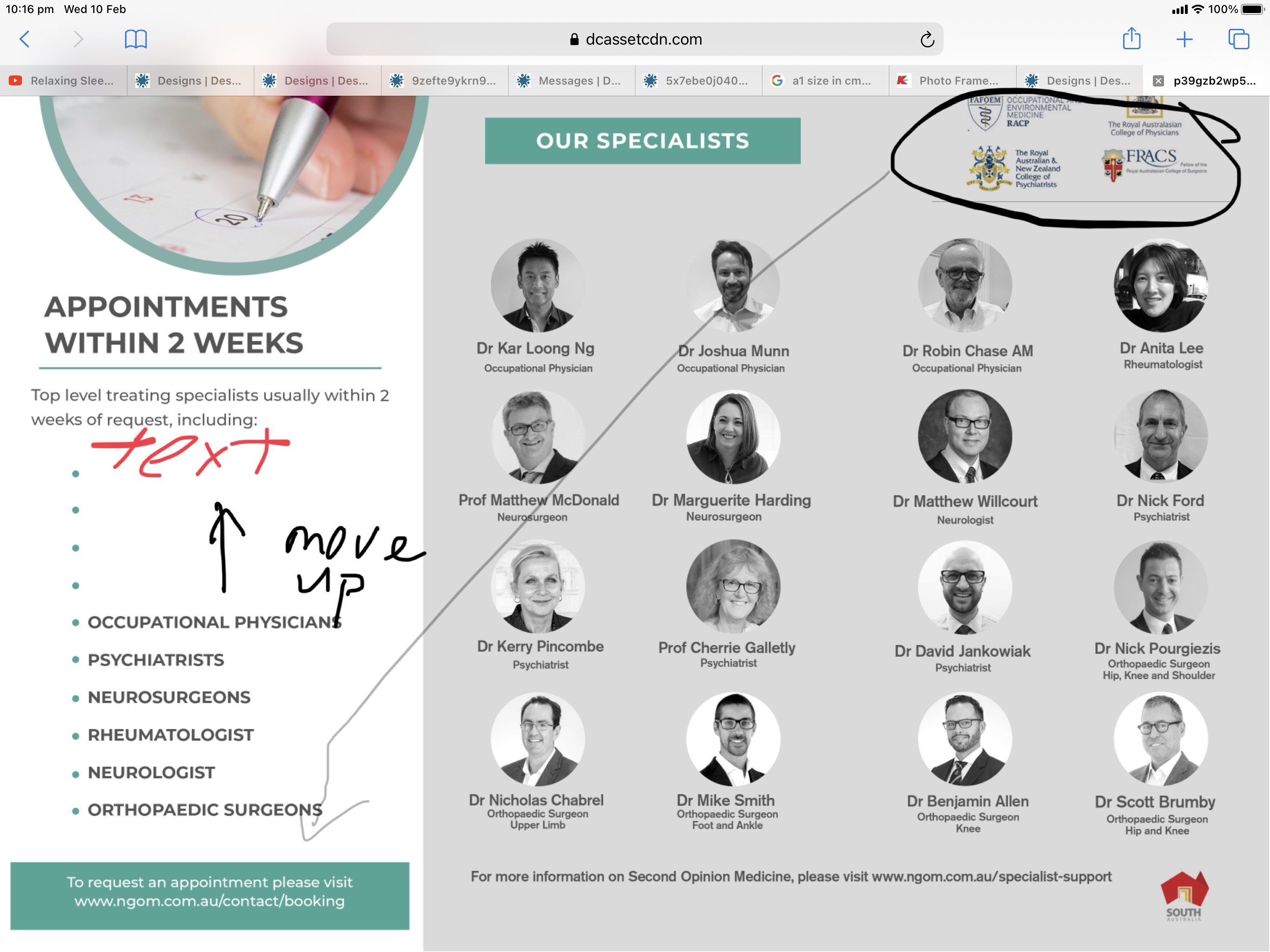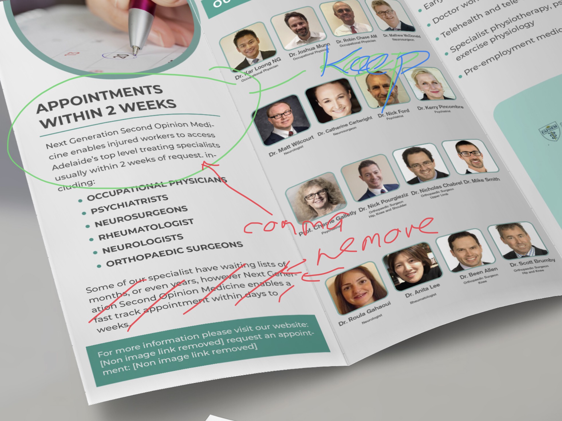 We need a brochure to give to General Practitioners. We are a group of medical specialists offering fast appointments for GPs and their patients. The service is called Second Opinion Medicine. Our old brochure has been uploaded and we wish to update it with our new logo and colour scheme. For specialist photos - we need 16 frames,