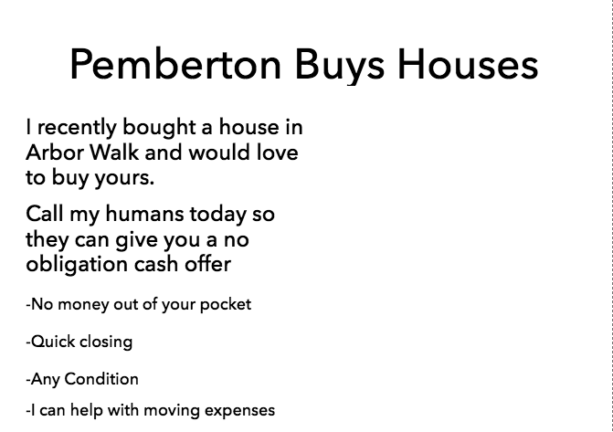 We will be sending these postcards to homeowners that may be interested in selling their house. Our business is themed around our dog "Pemberton"- Pemberton Buys Houses. We are using her as the focal point of the business because typically these homeowners get lots of mailers that are similar and we would like stand out with an inviting puppy dog.