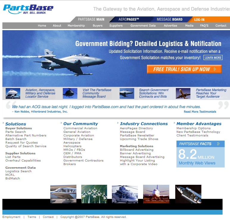 PartsBase Inc, is an e-commerce platform driven by an aviation parts locator. We are looking to totally redo our homepage, log-in page, standard part search page, and results page.