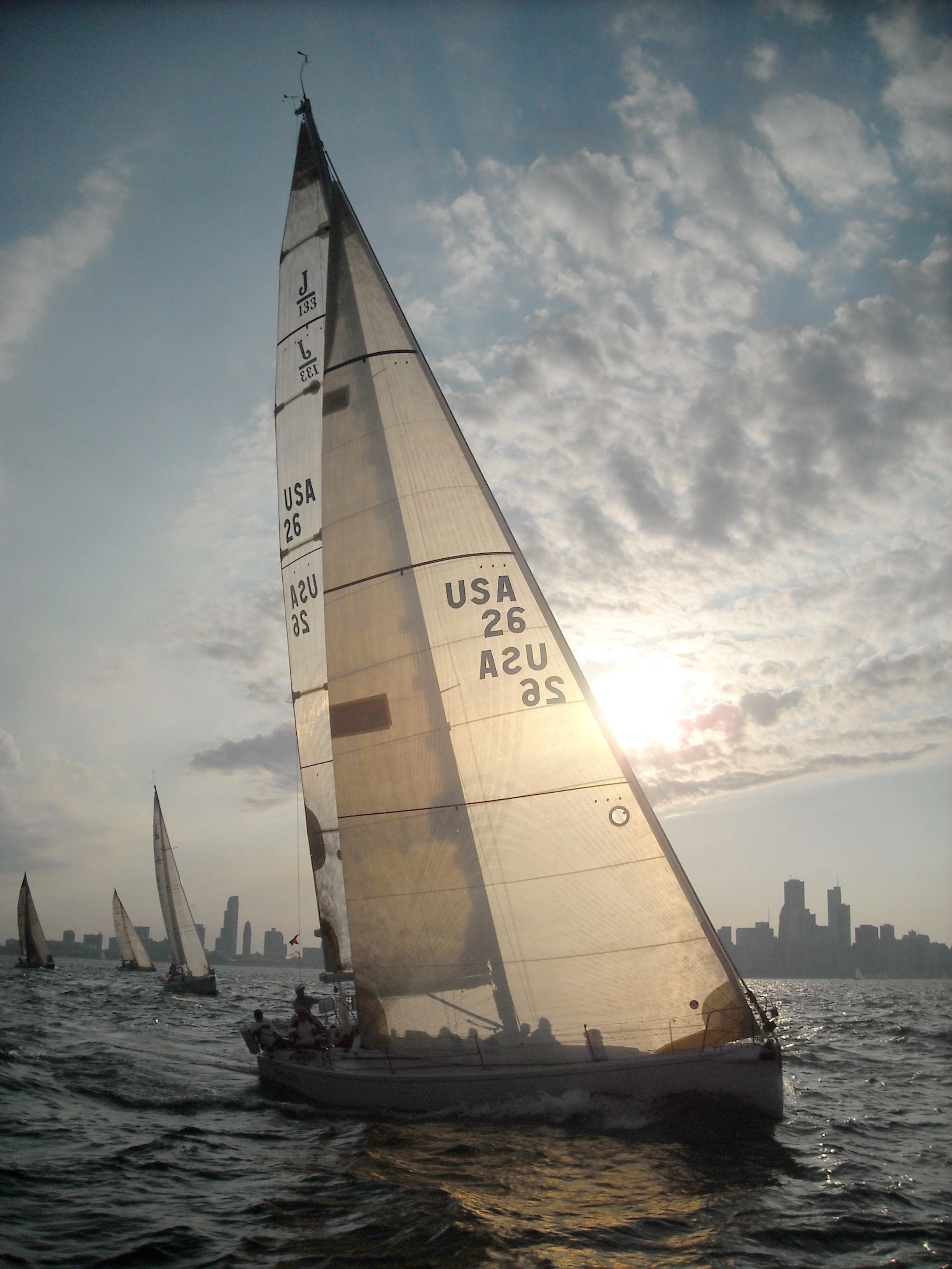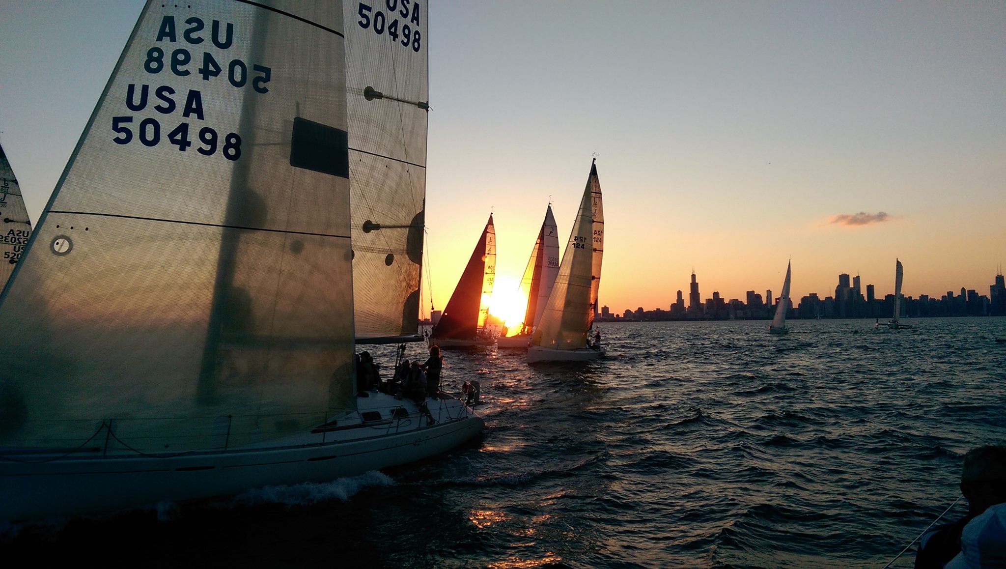 - sailboats, Chicago skyline, sunset, on the water, "2015 Chicago Beer Can Series"
